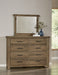 Vaughan Bassett Yellowstone American Dovetail Mirror in Chestnut Natural 782-448. Substantial solid white oak mirror with all the splits; cracks; knot holes – all of the aging and refining that can only be provided by Mother Nature herself. American Dovetail design feature on top corners. Vaughan Bassett has developed a patent-pending process that allows them to accelerate how wood ages. We have kept the splits; knots; cracks; and the bold grain pattern found in Oak lumber to create this reclaimed look in this beautiful and unique bedroom.
